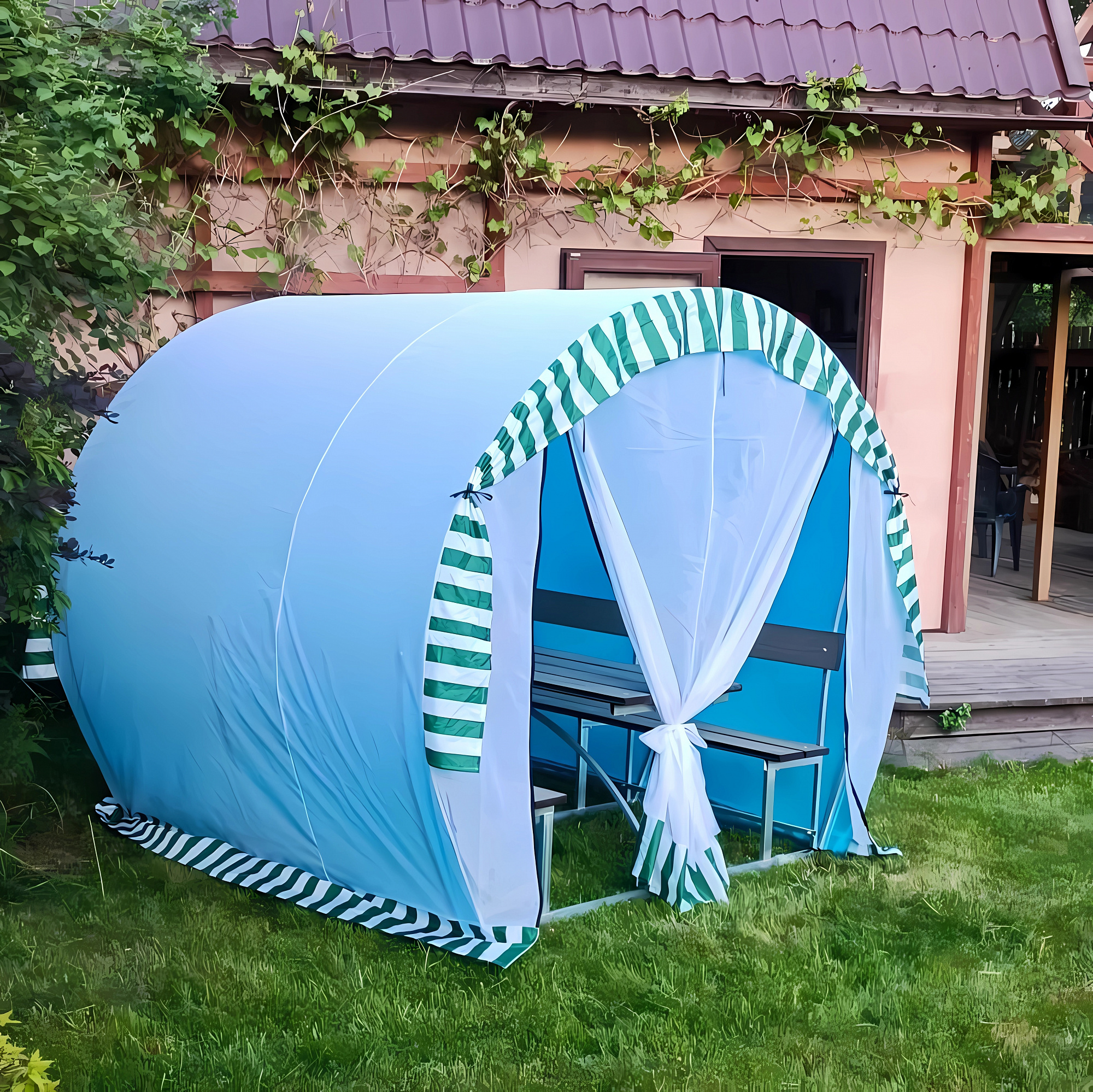 Красивые портьеры и ламбрекены позволяют создать домашний уют даже на приусадебном участке.